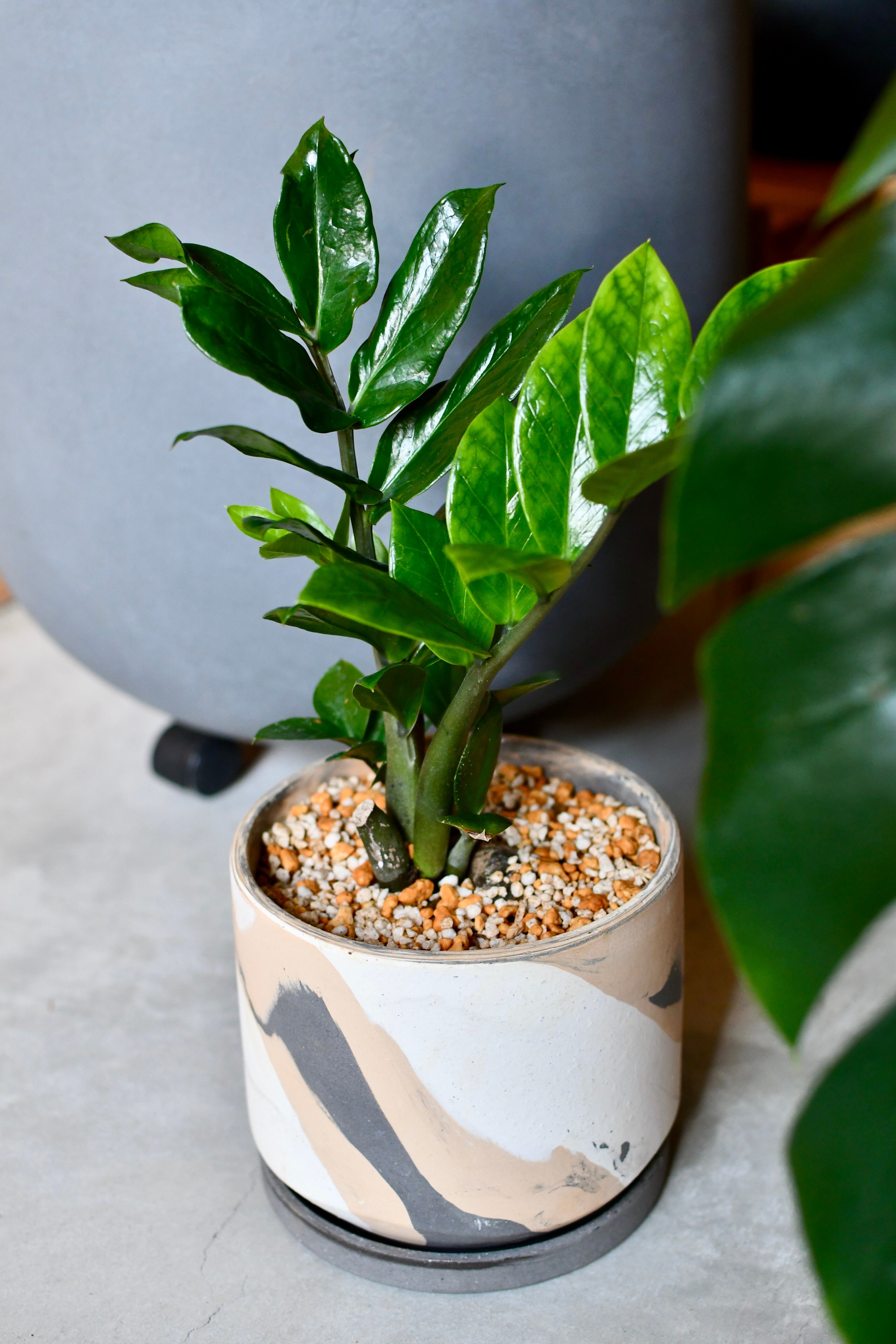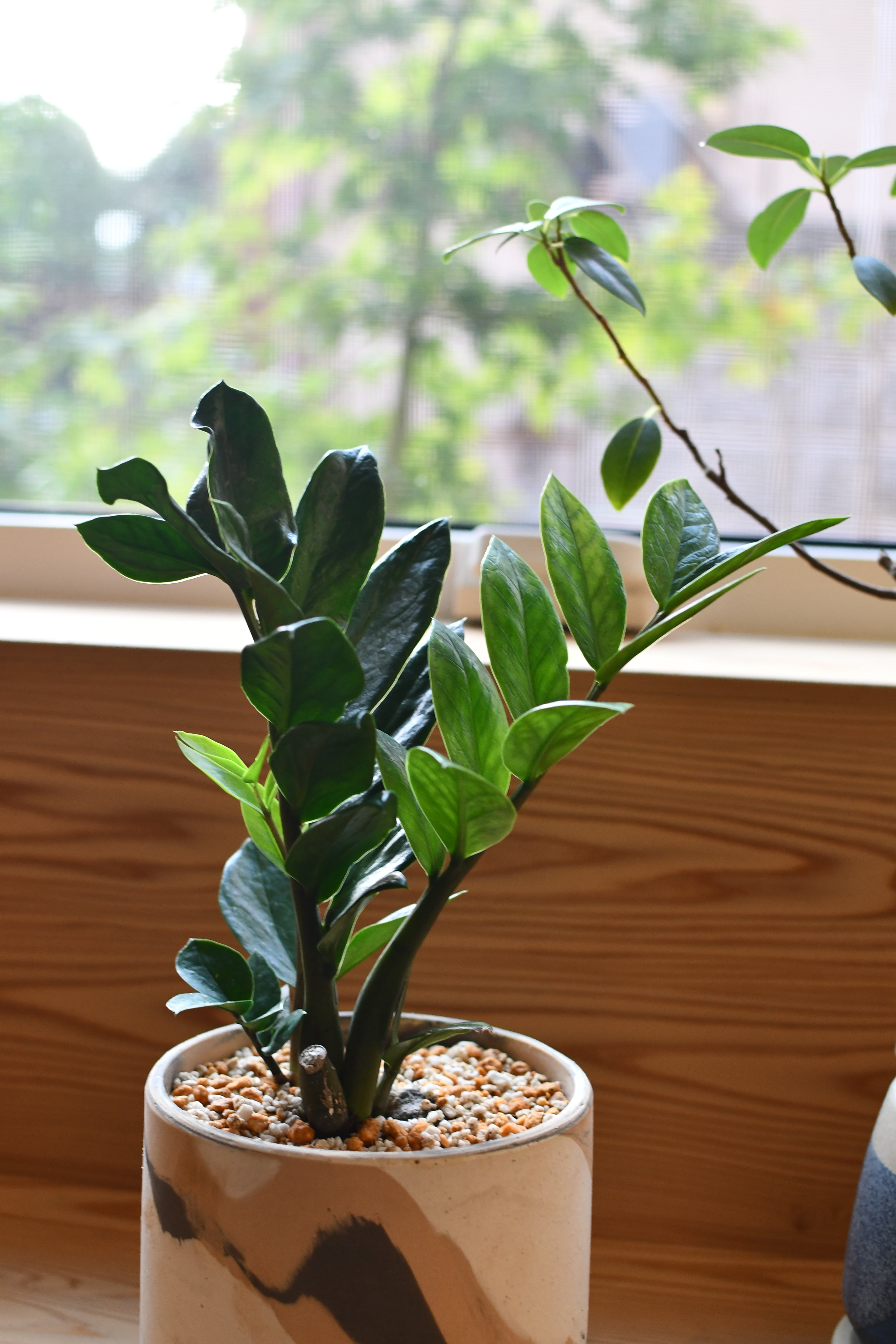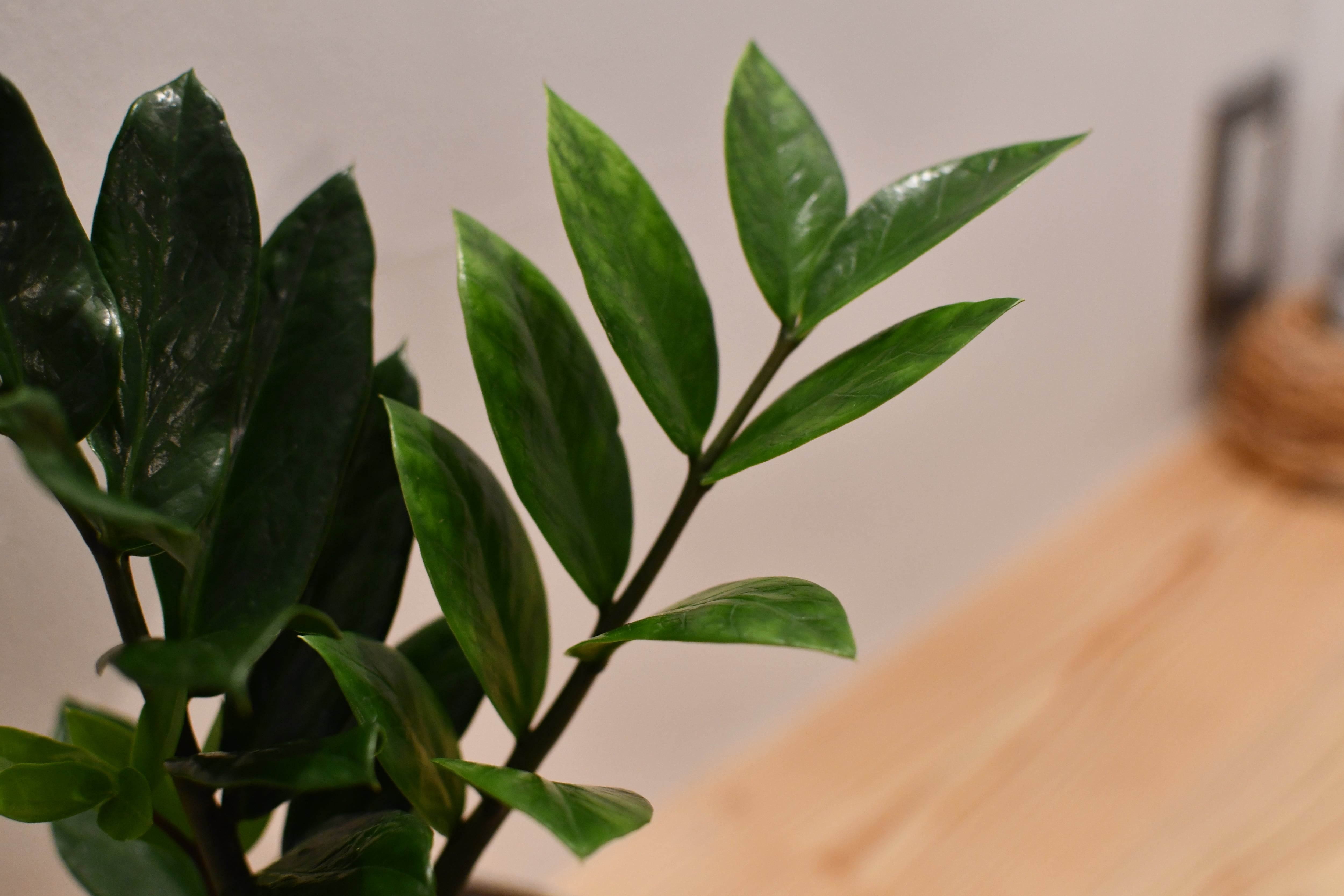 ザミオクルカスは、光沢のある肉厚な葉が美しく、丈夫で育てやすい植物です。サトイモ科に分類され、アフリカ原産の観葉植物になります。成長するに従い羽状複葉が増え、地下に塊茎を持つため乾燥にも強い特徴があります。葉は左右対称に整然と並び、ツヤのある濃緑色の葉が規則正しく展開する姿がスタイリッシュで人気です。