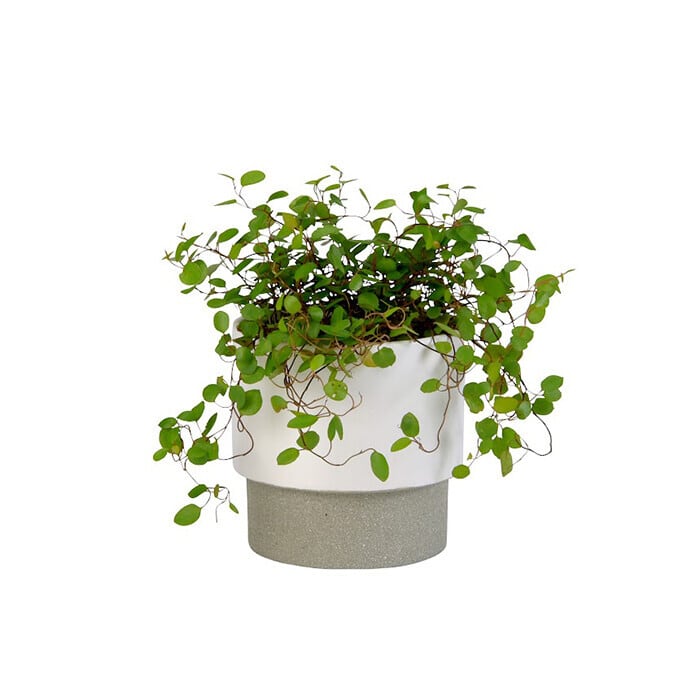 上下のカラーは異なるものの、シンプルナチュラルな組み合わせ。植物のグリーンが映える鉢カバーです。