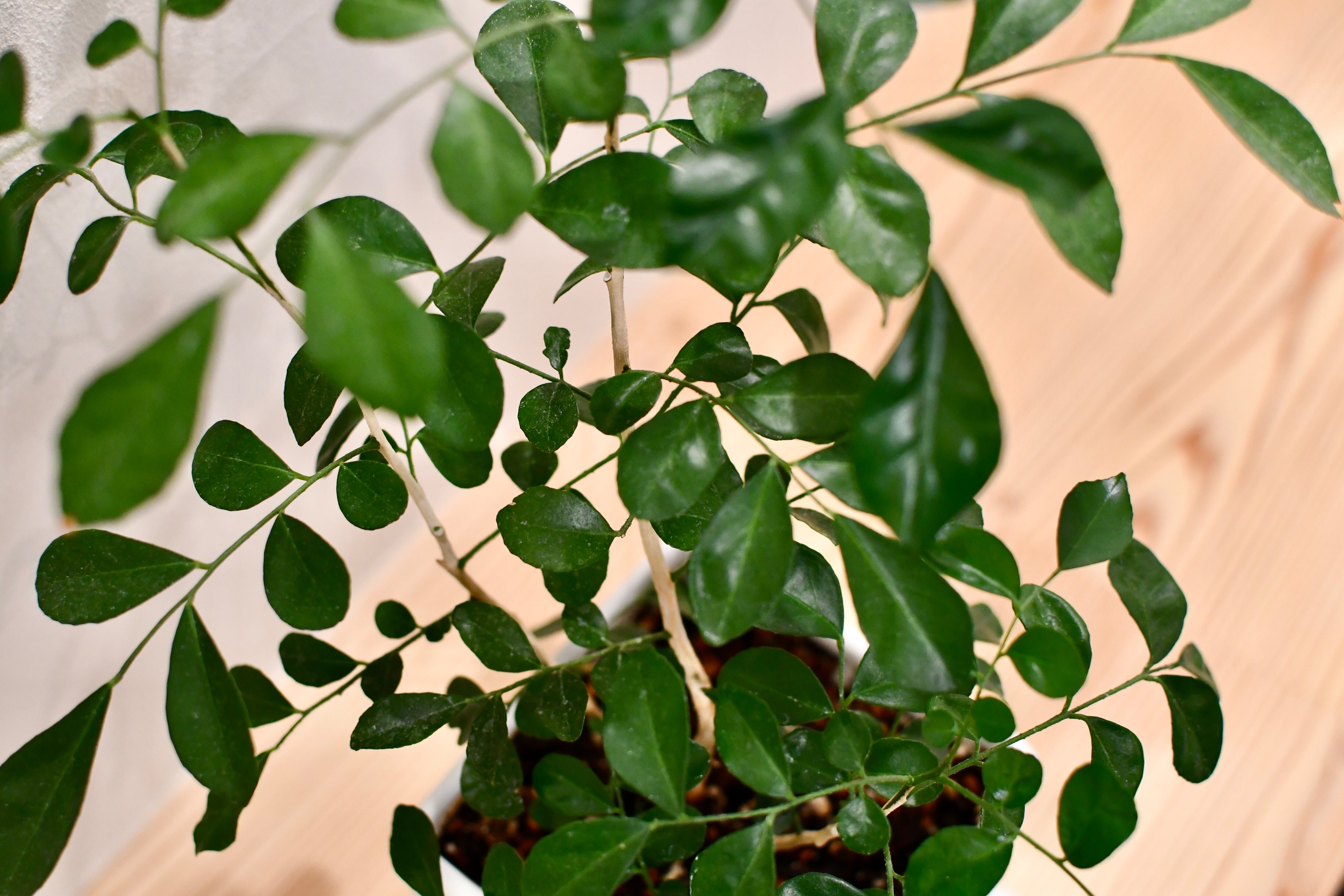 成長するに従い枝分かれして茂り、羽状複葉の小葉が規則正しく並びます。葉は濃い緑色でツヤがあり、密に茂る姿が美しく、初夏から秋にかけて白い星型の花を咲かせ、ジャスミンに似た甘く爽やかな香りを放つ特徴があります。花後には赤い小さな実をつけることもあり、四季を通じて楽しめる観葉植物として人気です。