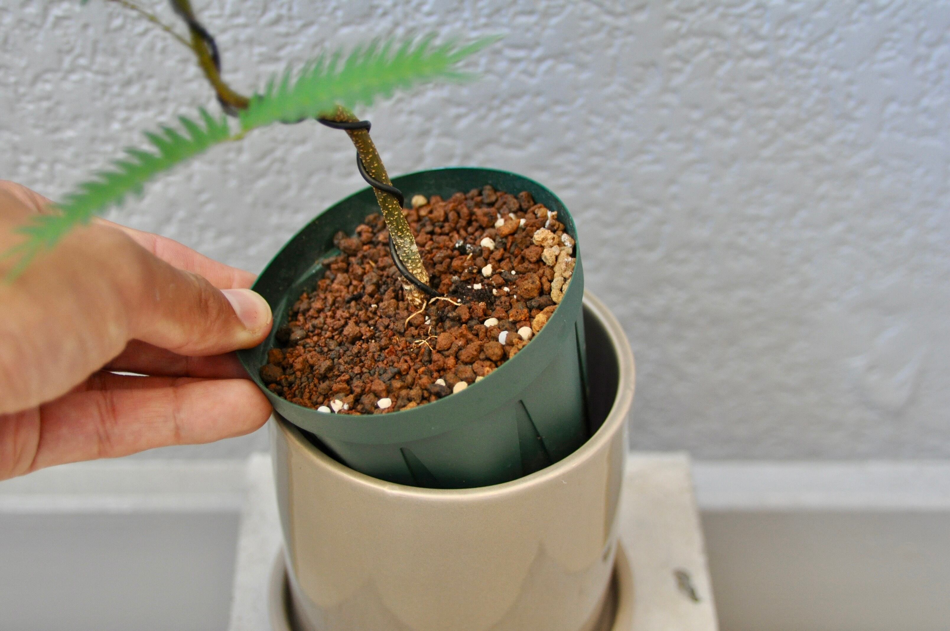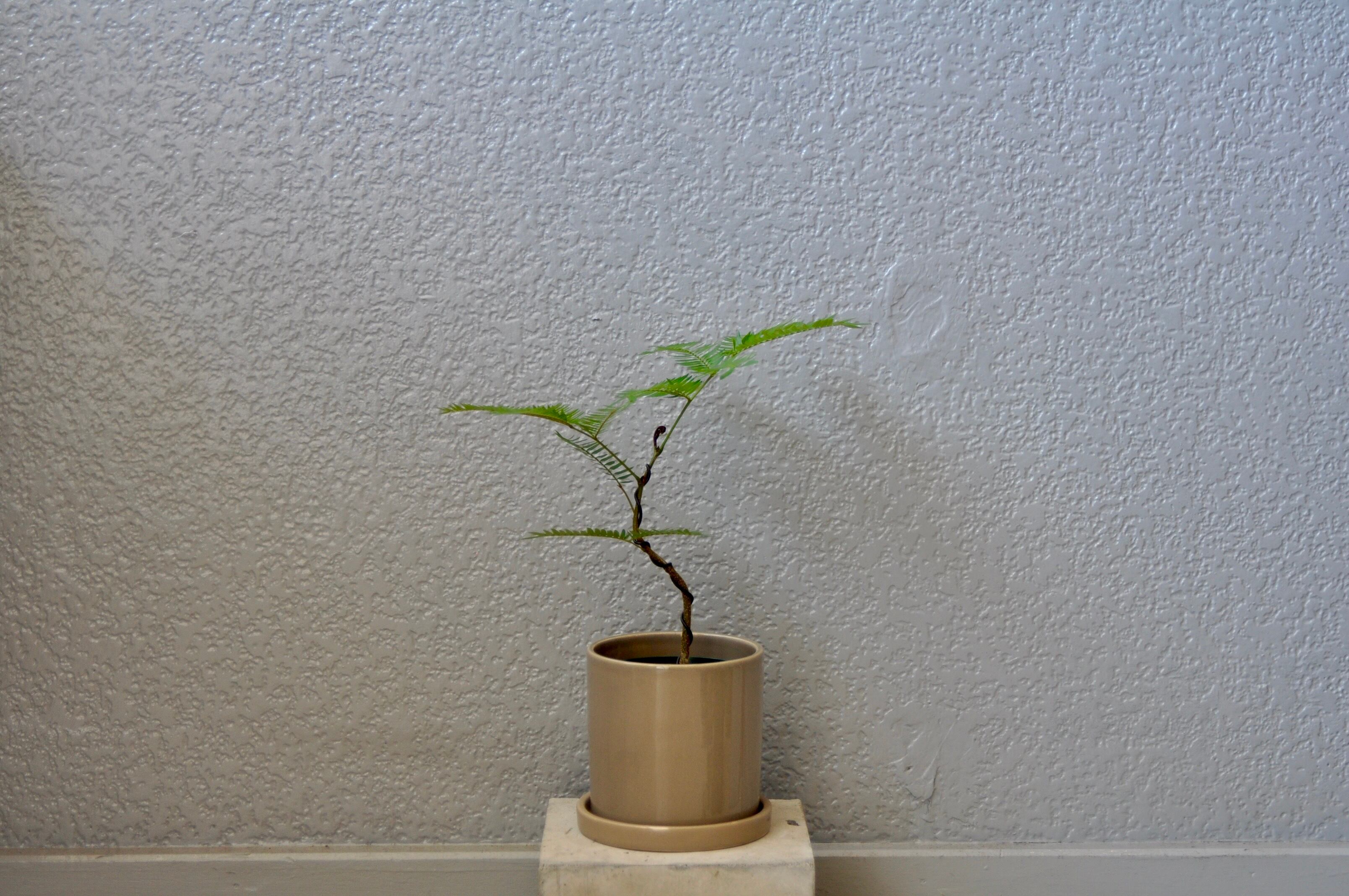 盆栽仕立て・曲がりエバーフレッシュ/スリット鉢+陶器鉢・ベージュ