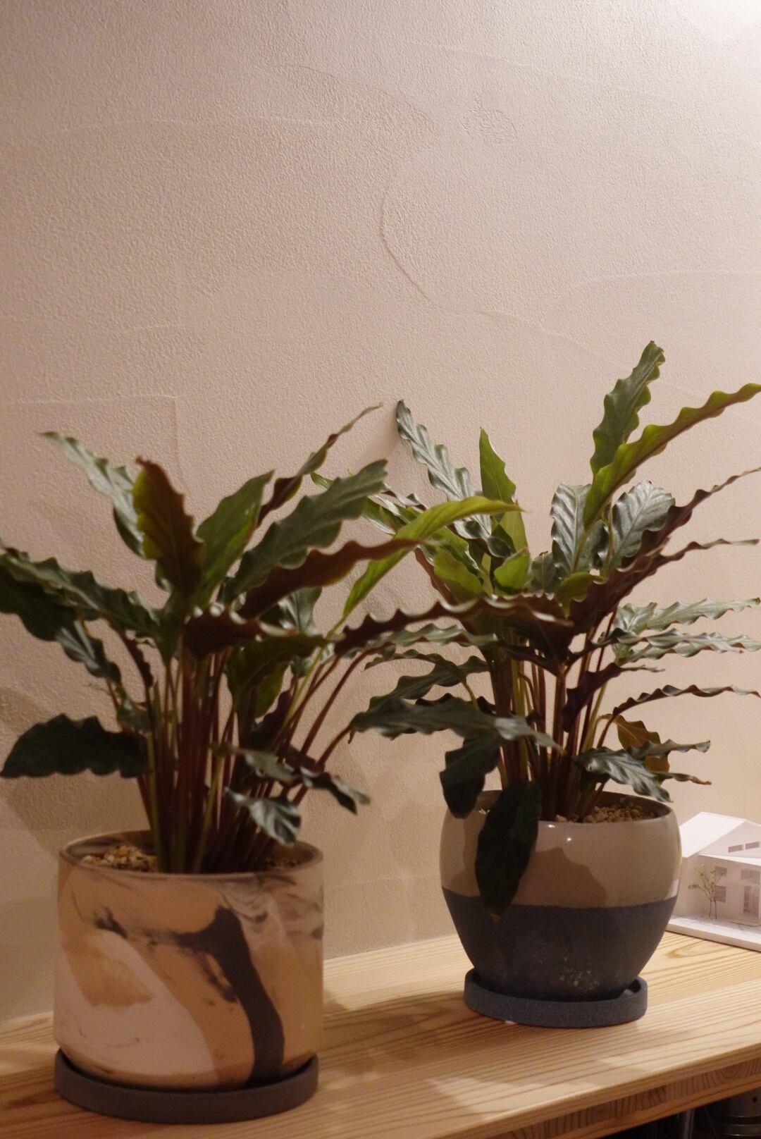 雰囲気から人気があります。品種によって葉の形や模様が様々。夜に葉裏が見えるように立ち上がる